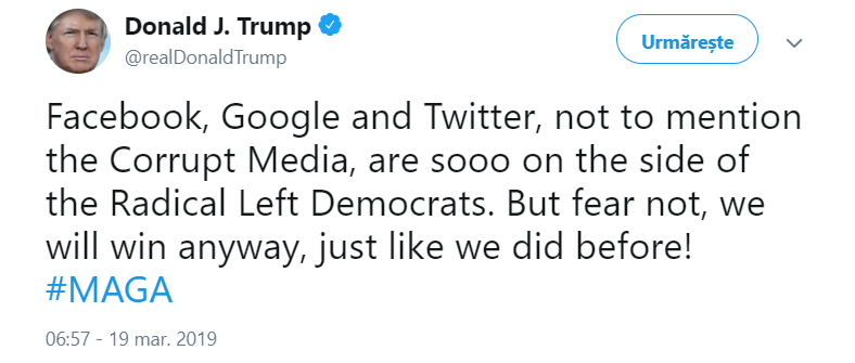 „Facebook, Google şi Twitter, ca să nu mai zic de Presa Coruptă, sunt atât de clar de partea democraţilor de extrema stânga. Dar nu vă temeţi, vom câştiga oricum, la fel cum am făcut şi înainte! #MAGA”, a scris Trump pe Twitter, făcând referire prin MAGA la sloganul său de campanie „Make America Great Again” („Să facem America grozavă din nou”).