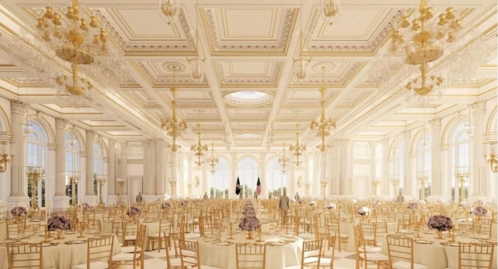 Donald Trump îşi propune ca sala de bal să poată găzdui până la 1.000 de persoane pentru recepţii şi dineuri în onoarea demnitarilor străini. Imaginile proiectului arată un interior luxos, bogat în auriu şi candelabre, care aminteşte de sălile de recepţie ale cluburilor de golf deţinute de preşedinte.