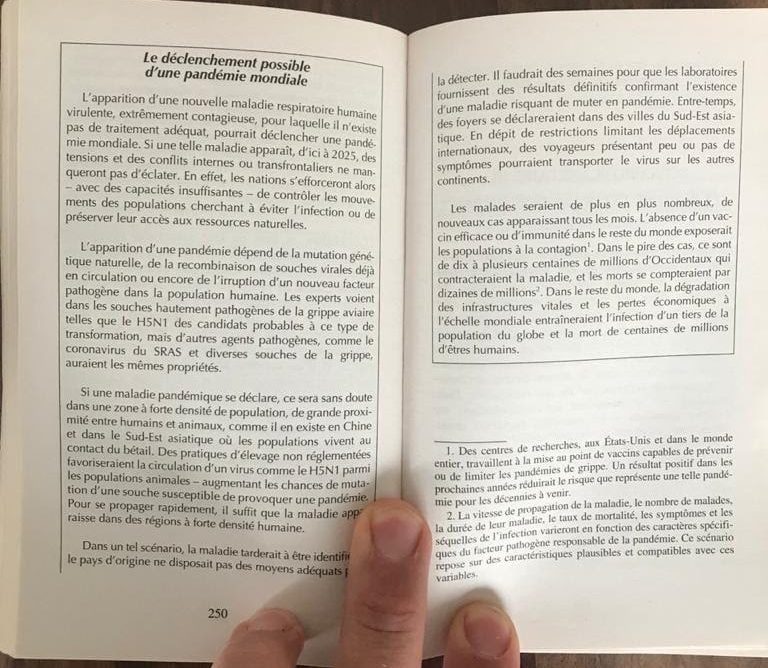 Între provocările de viitor menționate de CIA, publicistul francez se oprește în special asupra posibilității unei crize mondiale de sănătate: „Puțin mai probabil, mai amintim într-o casetă și transmiterea unei boli infecțioase fără vaccin cunoscut”, notează autorul prefeței. „Aceste noi amenințări presupun multe acțiuni tehnologice de supraveghere și protecție, cum ar fi stocurile de vaccin, pe care va trebui să ne gândim să le luăm în viitor”, avertiza el, în 2009. A fost auzit doar de cei care aveau urechile pregătite pentru așa ceva – producătorii de vaccinuri, care au ieșit pe piață în numai câteva luni.