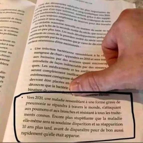 „Spre anul 2020, o boală care va semăna cu o formă gravă de pneumonie se va răspândi în întreaga lume, atacând plămânii și bronhiile și fiind rezistentă la toate tratamentele cunoscute. Mult mai stupefiantă decat boala în sine va fi dispariția sa bruscă și reapariția ei 10 ani mai târziu, înainte de a disparea pentru totdeauna la fel de rapid precum a apărut.”