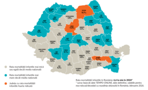 RATA MORTALITĂȚII INFANTILE ÎN ROMÂNIA 2024; sursă hartă: Salvați Copiii