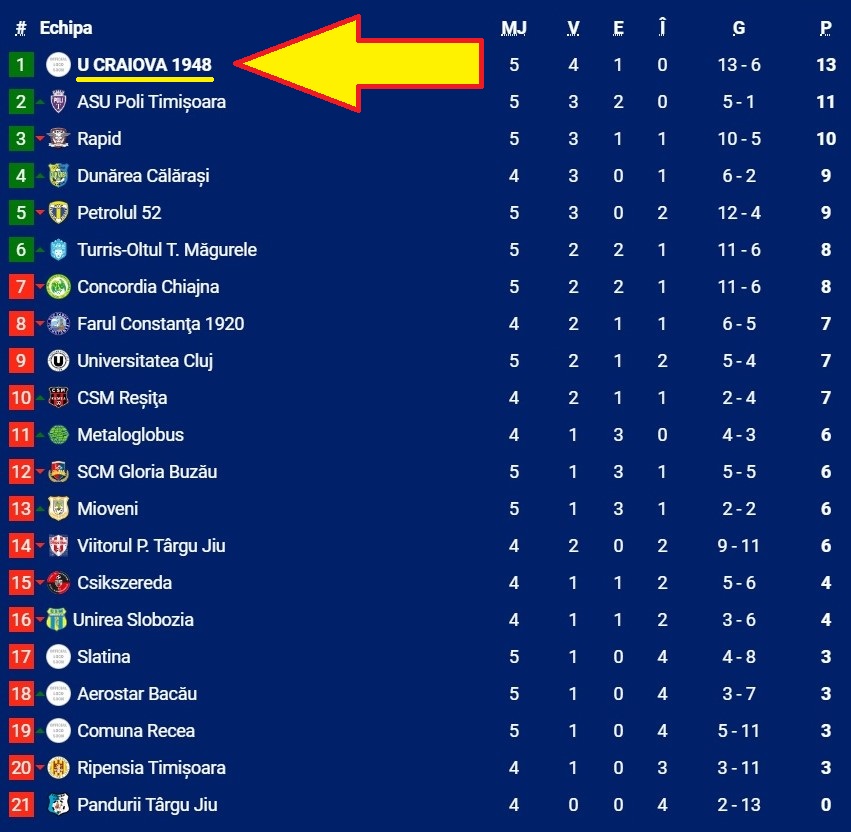 După primele cinci etape ale campionatelor de fotbal din România, în clasamentele respective apare o situație foarte rar întîlnită: ambele echipe din Craiova, CS Universitatea și FCU Universitatea ocupă primul loc în Liga I respectiv, Liga a II-a.