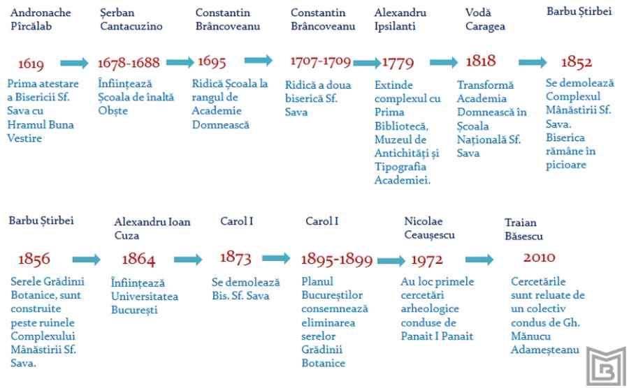 Am discutat anterior despre Biserica și cimitirul complexului Mânăstiresc de la Sf. Sava. Nimic din acest complex nu mai este azi în picioare. A supraviețuit însă povestea construită din documente, fotografii, hărți și cercetări arheologice și în ciuda a ceea ce s-ar putea crede, nu este legată atât de mult de istoria așezămintelor ecleziastice, cât de cea a învățământului superior din Țara Românească.