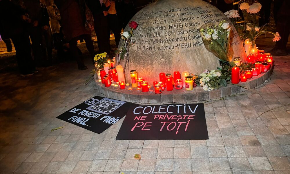 UPDATE: „Corupția ÎNCĂ ucide” a fost unul dintre mesajele pe care oamenii le-au rostit în timpul marșului, dar și al momentului de reculegere din apropierea zonei în care a funcționat clubul Colectiv. Tot aici există și un monument al victimelor incendiului.