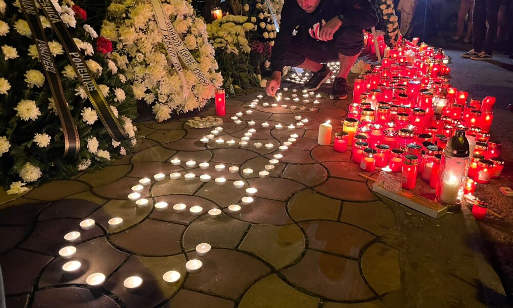 UPDATE: Oamenii au ajuns la monumentul victimelor incendiului din clubul Colectiv. Aceștia au adus flori, au aprins  lumânări și plâng privind la fotografiile oamenilor care au murit cu 10 ani în urmă.