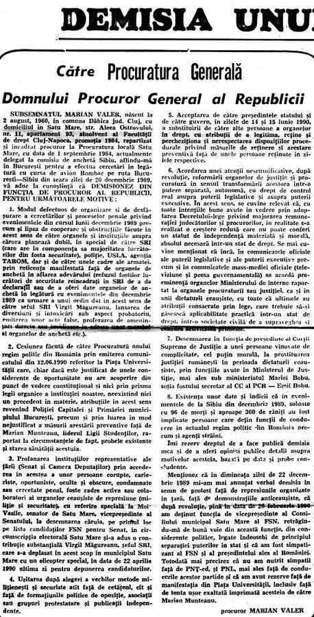 Ca dovadă că nu toți magistrații vremii au înghițit gălușca aruncată de conspiratorii cu epoleți stă demisia fostului procuror Valer Marian, publicată în revista „Expres” nr. 28, din 2 august 1990. Vă prezentăm un fragment din demisie, un adevărat rechizitoriu la adresa noilor stăpâni ai României postdecembriste :