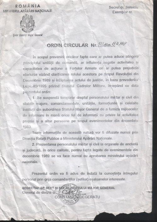 Ca dovadă că în dosare a ajuns numai ce trebuie, stă ordinul circular secret nr. 522 din 19.11.1997 emis de Marele Stat Major al MApN, sub semnatura generalului Constantin Degeratu. Ordinul confirmă intervenția brutală și ilegală a MApN în actul de justiție. Așa s-a călcat în picioare adevărul revoluției române. Cu bocancii. Ordinului 522/1997, prin semnătura generalului Constantin Degeratu, secretar de stat și șef al Marelui Stat Major la acea vreme, suspenda temporar” dreptul tuturor angajaţilor din subordinea SMG, militari sau civili, de a furniza (presei sau organelor de anchetă) informaţii cu privire la activitatea proprie sau a altor persoane pe timpul evenimentelor din Decembrie 1989″.