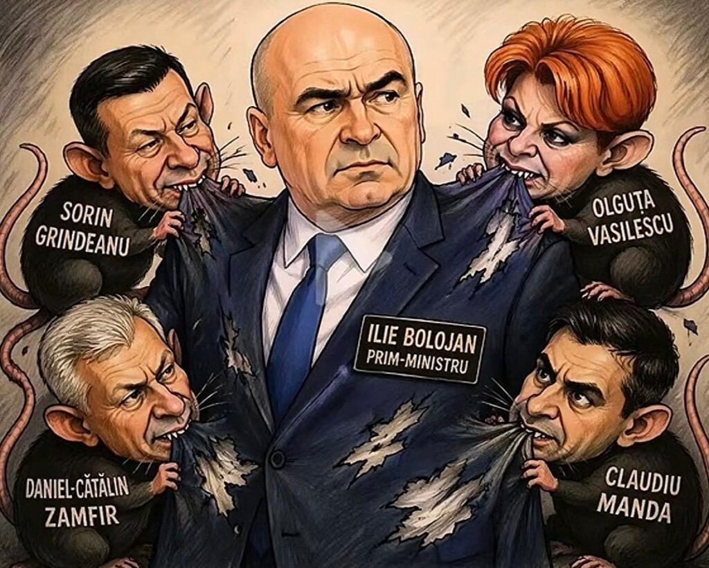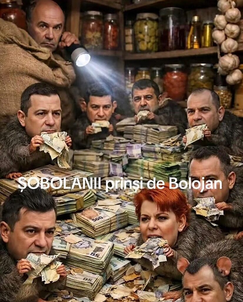 Pe Facebook și TikTok e prăpăd. Internauții au trecut la metafore cu blană și coadă. În imaginile care circulă rapid pe online-ul românesc, Ilie Bolojan e „exterminatorul” de serviciu, omul care a venit să dea cu mătura și să pună „dăunătorii” pe fugă. Într-o parte îl vezi pe premier cum dă un șut decisiv unei rozătoare, în alta îl vezi cu o lanternă în mână, surprinzându-i pe „greii” PSD fix în cămară. E acolo o întreagă adunare, cu Grindeanu și Olguța Vasilescu în frunte, înfățișați cum rod cu poftă din teancurile de bani, de parcă bugetul țării e cașcavalul lor de acasă.