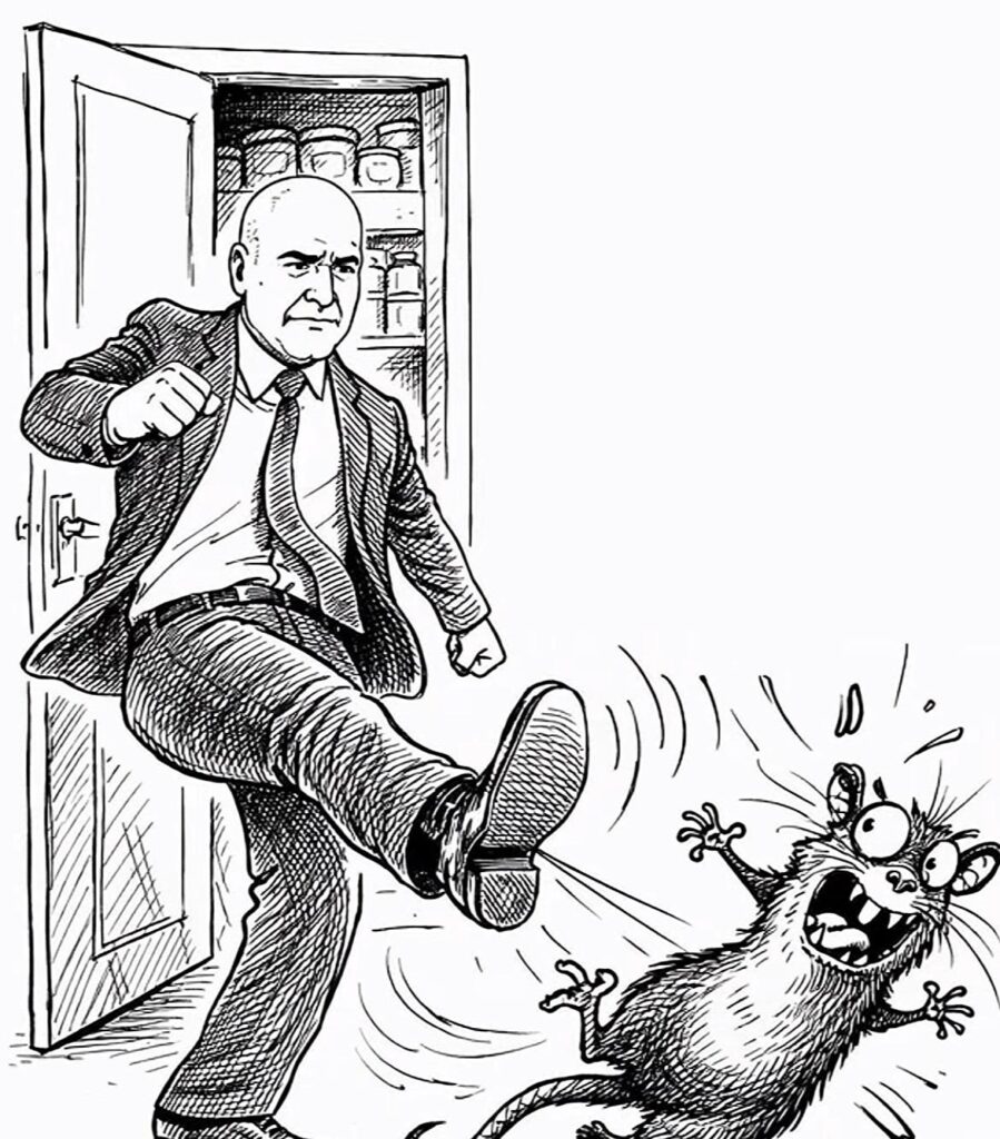 În „casa șobolanului”, Grindeanu apare mândru lângă „cașcaval”, înconjurat de alte rozătoare care păzesc prada. Dar, exact când mustăcea mai fericit, ușa se izbește de perete și apare Bolojan cu un spray uriaș anti-rozătoare, trecând direct la eliminarea „dăunătorilor” care s-au cuibărit la putere.