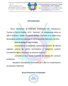 Unitatea- Sindicatul Liber Metrou (USLM) precizează, referitor la greva de vineri de la Metrorex, că în cazul opririi voluntare a lucrului nu este necesară asigurarea unei treimi din activitate și anunță că a făcut 21 de adrese și 3 pichetări la Ministerul Transporturilor.
