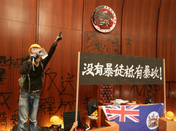 Militant pro-democrație la tribuna Consiliului Legislativ din Hong-Kong, 1 iulie 2019.