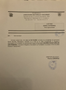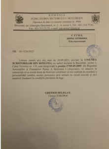 La fel, comunicările primite de ziarul Cotidianul (pe care le reproducem alăturat) obligă la aceleași clarificări. O punere urgentă în acord cu legea a documentelor de funcționare a Uniunii Scriitorilor din România.