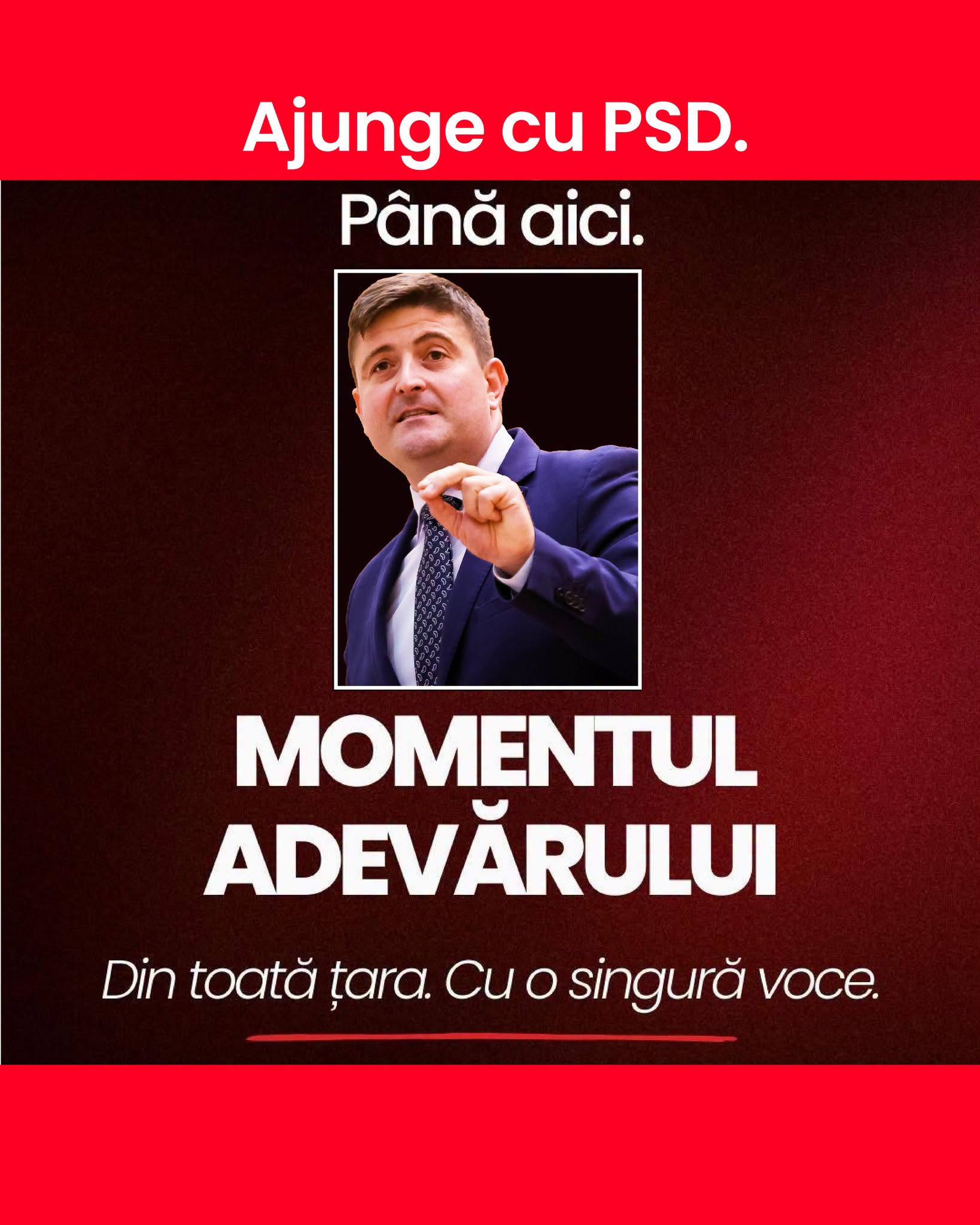 „Ajunge. Până aici”, scrie deasupra pozei PSD-istului cu pricina. Mai jos, politicianul, oricare ar fi acesta, anunță că „votez la momentul adevărului”. După principiul votului democratic și al pluralității de opinii, și mai jos se sugerează că social-democrații gândesc toți la fel. „Din toată țara. Cu o singură voce.”