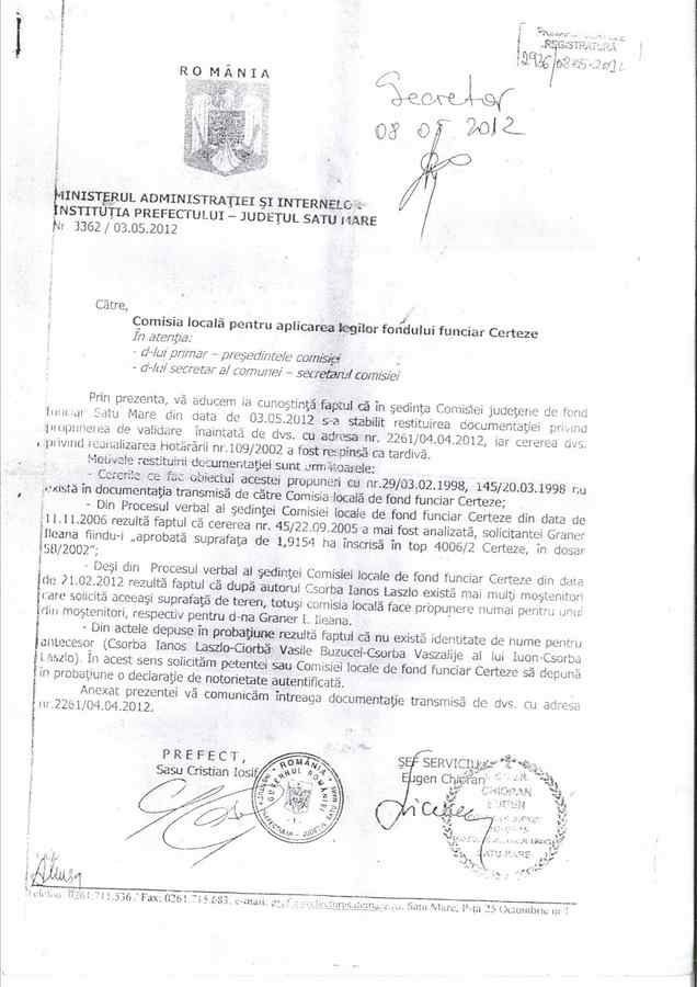 După ce Graner Vasile a făcut o plângere la Parchetul de pe lângă Judecătoria Negreşti Oaş împotriva hoților, magistrații au dat soluţie de neîncepere a urmăririi penale. Deși Ileana Sas (Lușca) are toate documentele în regulă, ba chiar Comisia locală de fond funciar din Certeze i-a recunoscut, în 2006, dreptul de proprietate asupra „1,954 ha de pădure în top 4006/2 Certeze”, femeia nu a fost pusă în posesie încă.